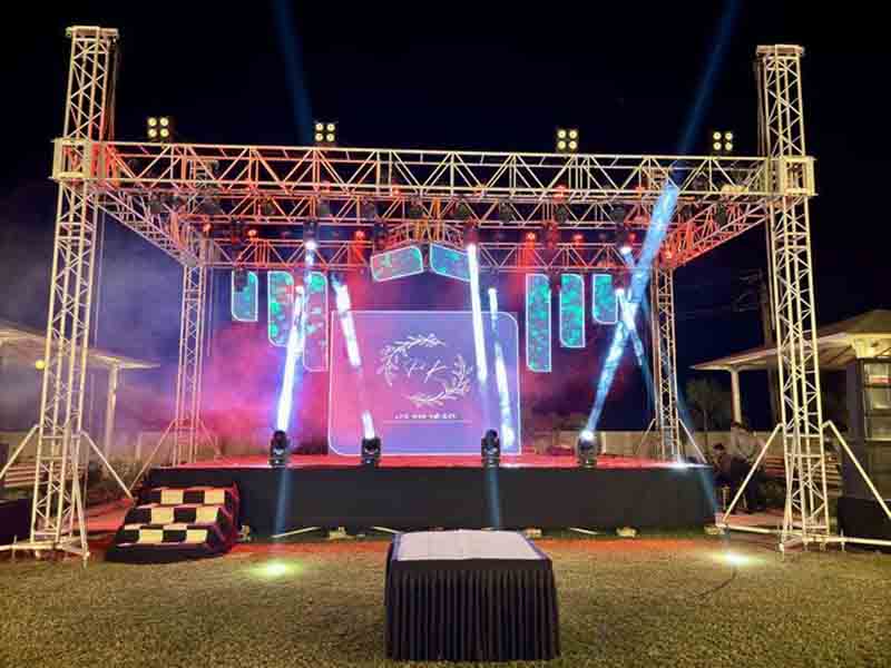 Nuestros escenarios están hechos de aleación de aluminio de primera calidad, lo que garantiza una fuerte capacidad de carga para iluminación, sonido, pantallas LED, cortinas y decoración de bodas.